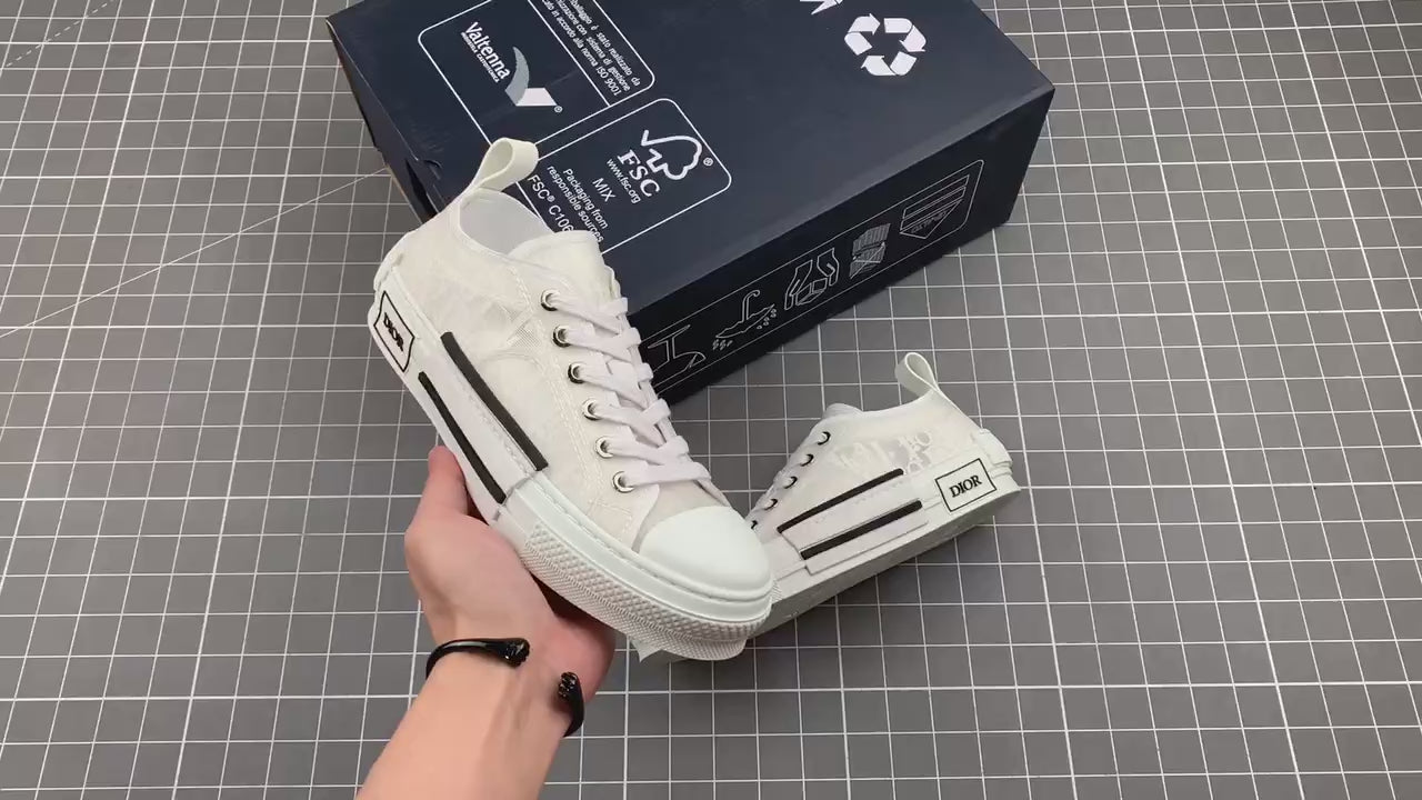 The B23 low-top sneaker is set apart by its white Dior Oblique motif and transparent paneling.