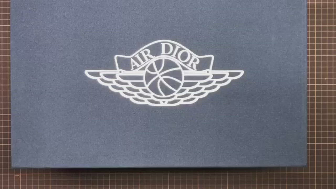 This Jordan 1 Retro High is composed of a white and grey leather upper with traditional Dior monogram print Swoosh. These shoes are made in Italy with premium materials. Co-branded icy translucent soles, Dior branded tongue and Wings logo, and a silver “Air Dior” hang-tag completes the design.